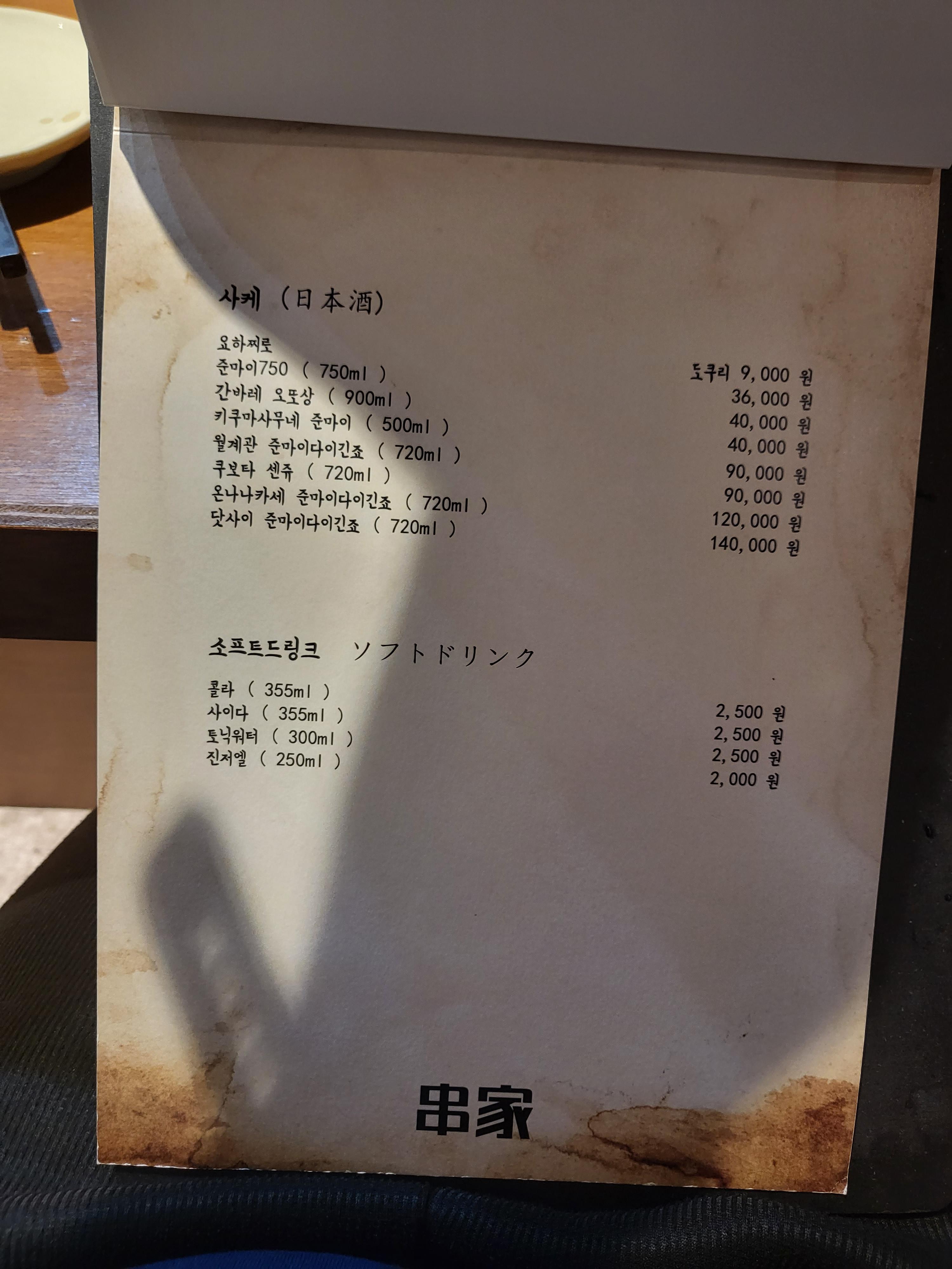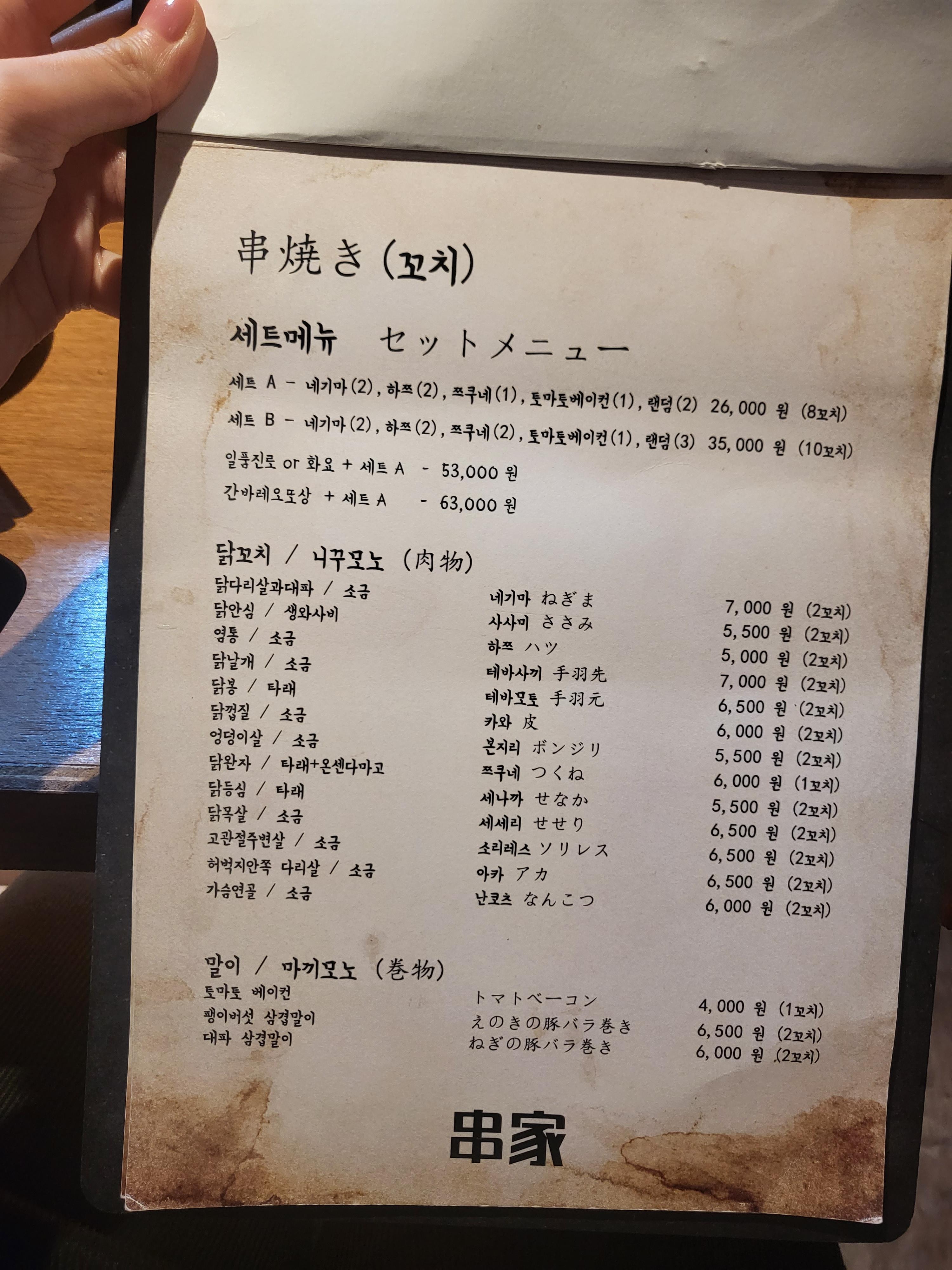 쿠시야 메뉴판입니다. 메인은 세트메뉴여서 우리는 A세트와 아사히 슈퍼드라이 410ML 생맥주 두잔을 주문했습니다. 세트메뉴에는 네기마, 하쯔, 쯔쿠네, 토마토베이컨, 랜덤 등 8꼬치가 나오는데 이름을 하나도 모르겠더라구요. 그래서 그냥 주는대로 먹었습니다 ㅋㅋ