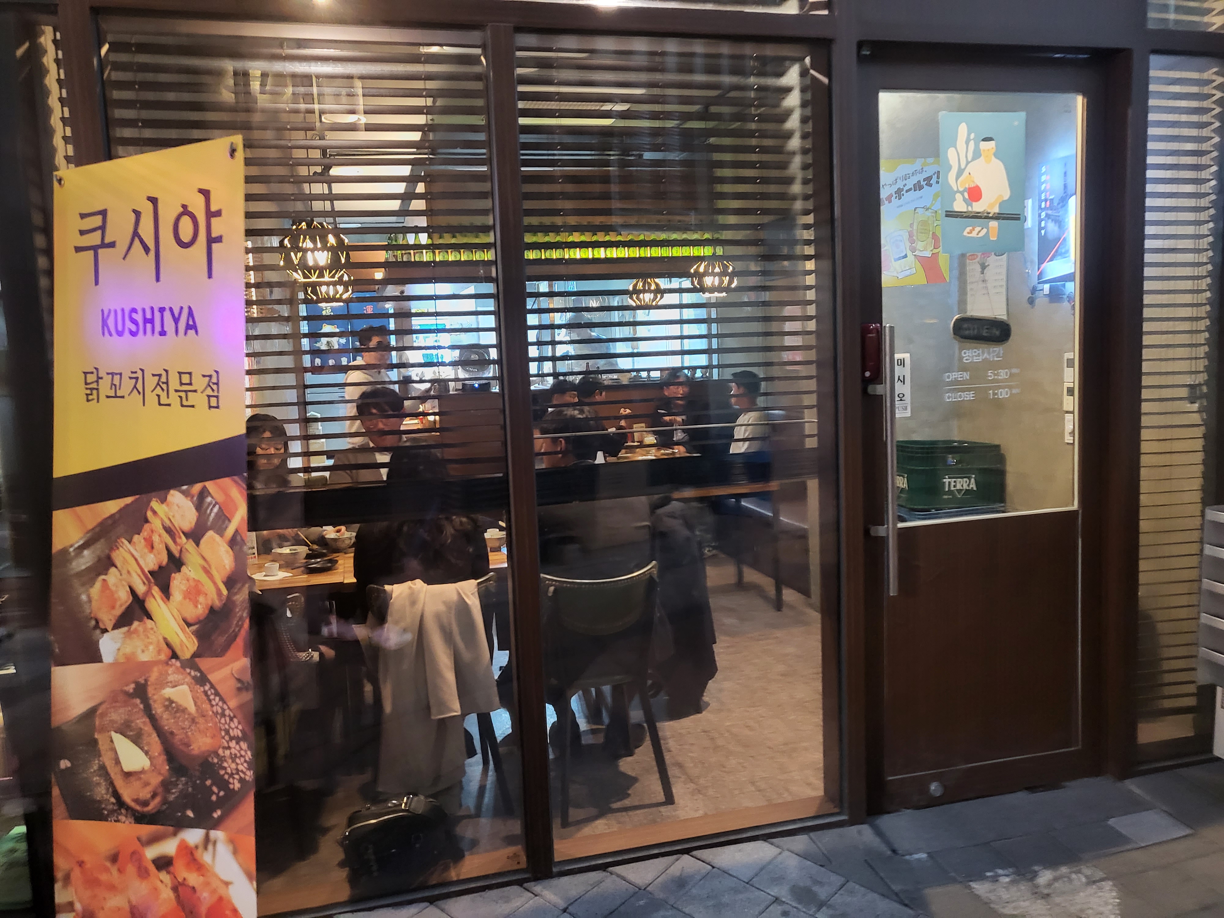 쿠시야는 보시는거처럼 내부가 그렇게 넓지 않아요. 테이블수가 많지 않다는거죠. 그러니 빨리 안가면 사람이 꽉찰수도 있으니 미리 예약하시는것도 좋을것 같네요. 그리고 가게 들어가보면 사장님께서 꼬치를 직접 굽기 때문에 나중에 추가주문할때 시간이 오래걸릴수 있다며 이를 양해해달라는 말씀도 하시더라구요.