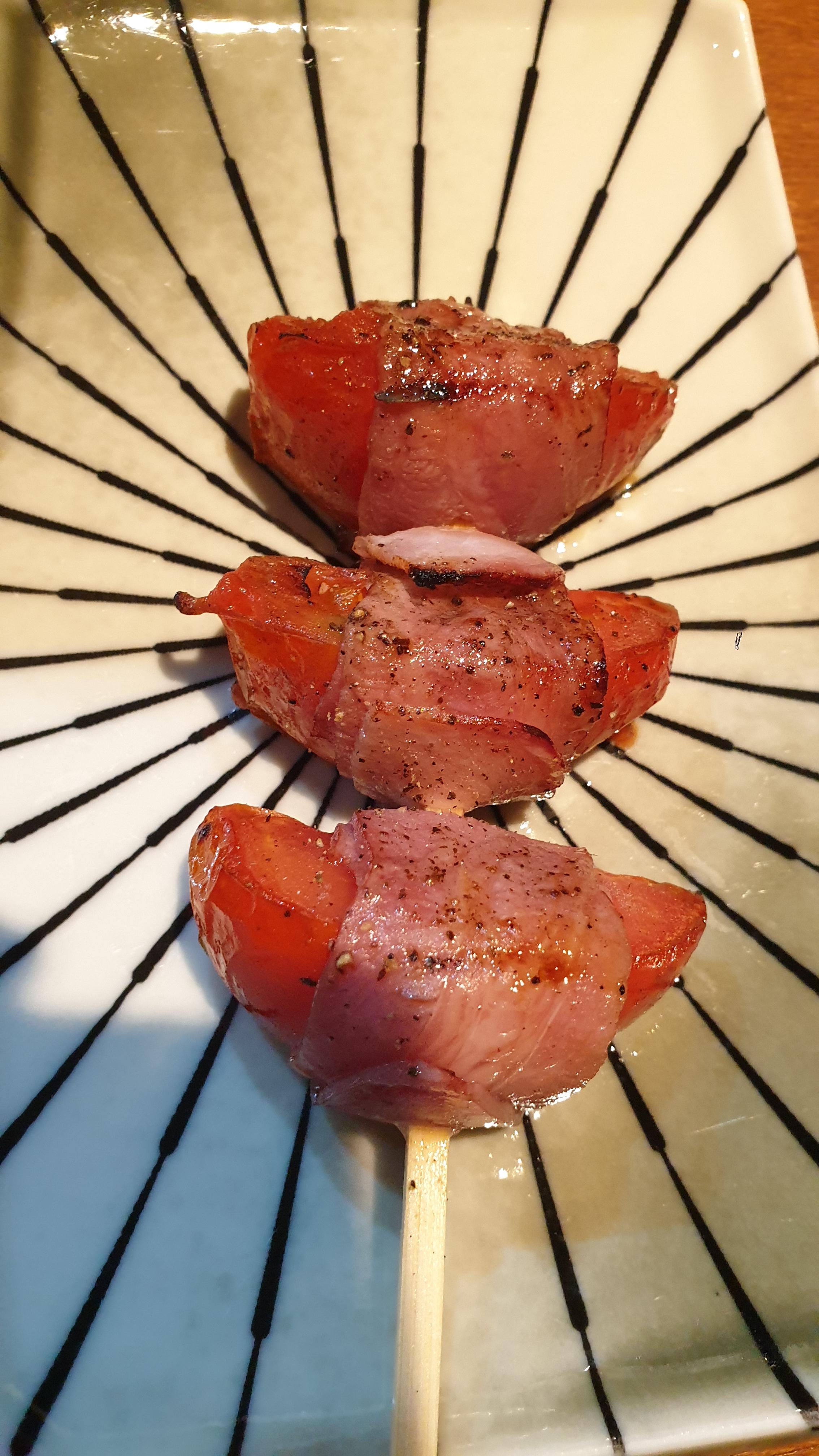 솔직히 메뉴 뭐라고 알려주셨는데 일본식 이름이라 한귀에 들어오지 않더라구요. 그냥 주시는대로 먹었습니다 ㅋㅋ 그중에 계란에 찍어먹는 저것도 맛있었고 토마토베이컨도 괜찮았습니다.