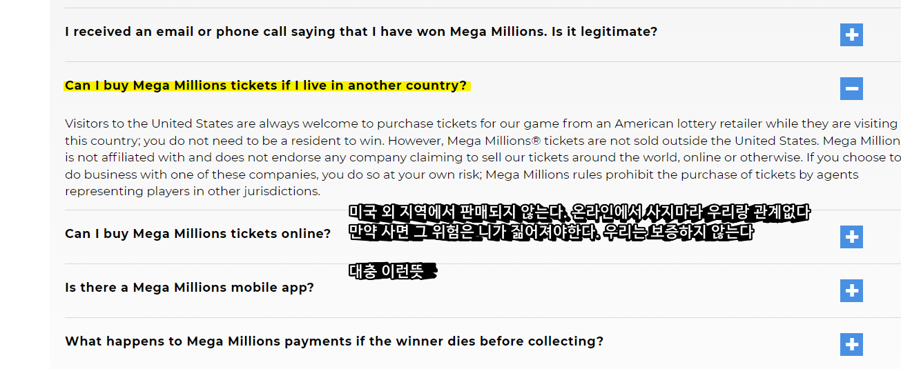 위에 말씀드렸지만 외국인도 미국 복권 구매가 가능합니다. 당연히 외국인 세율이 적용될거구요. 다만 외국인이 구매가 가능한것이지 온라인에서는 구매가 가능하진 않습니다. 미국 47개 지역에서만 구매가 가능합니다. 그리고 메가밀리언즈 홈페이지에서는 "온라인 또는 기타 방식으로 티켓을 판매한다고 주장하는 회사와 메가밀리언즈는 관계가 없다며, 그런 회사와 거래하는것에 대한 위험부담은 본인에게 있다"고 경고하고 있습니다.