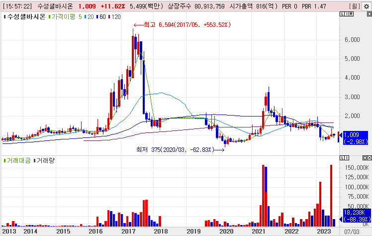 2023년 7월 24일 장마감후 수성샐바시온이 100억원 규모 제3자배정 유상증자를 공시하며 시간외 상한가를 기록.