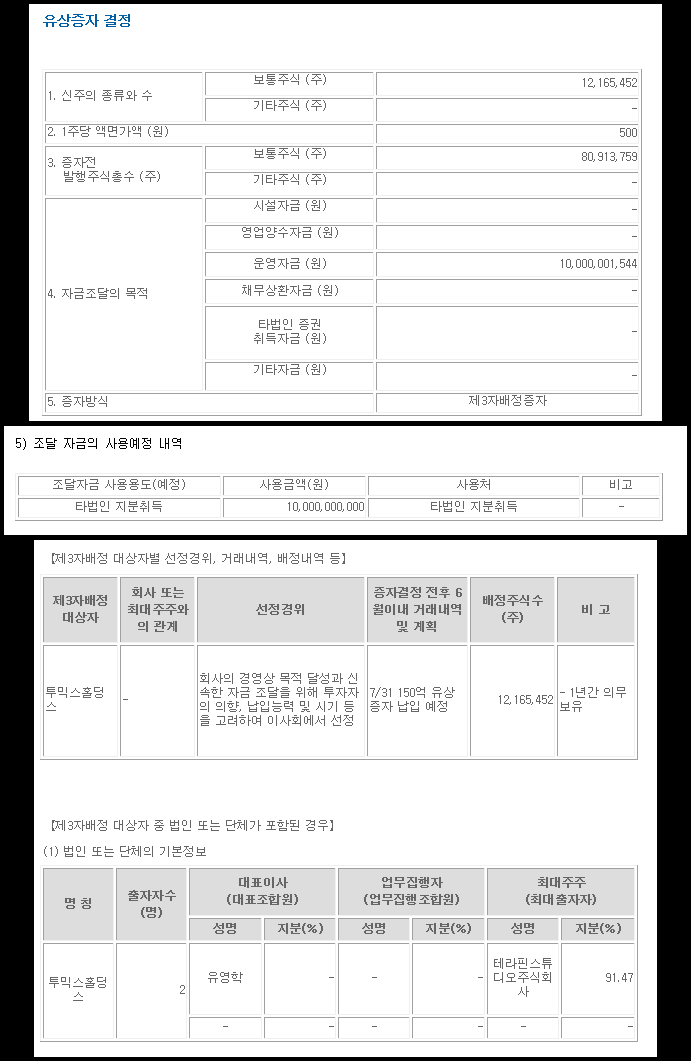 제3자배정 대상자는 투믹스홀딩스인데, 투믹스홀딩스는 테라핀스튜디오의 특수목적법인(SPC)로 볼수있고, 테라핀스튜디오는 나스닥 상장을 준비중인 글로벌 웹툰/컨텐츠 기업임.