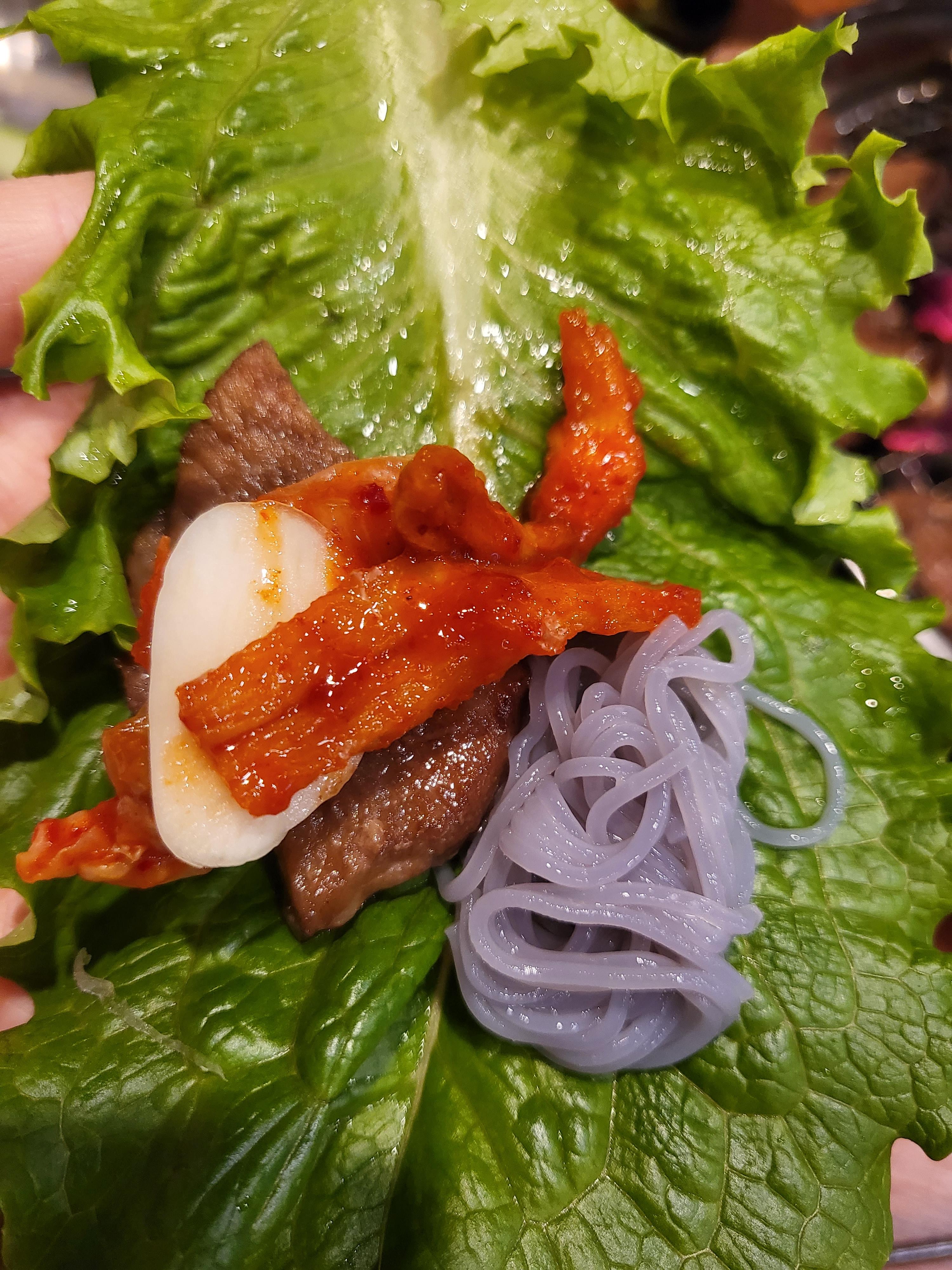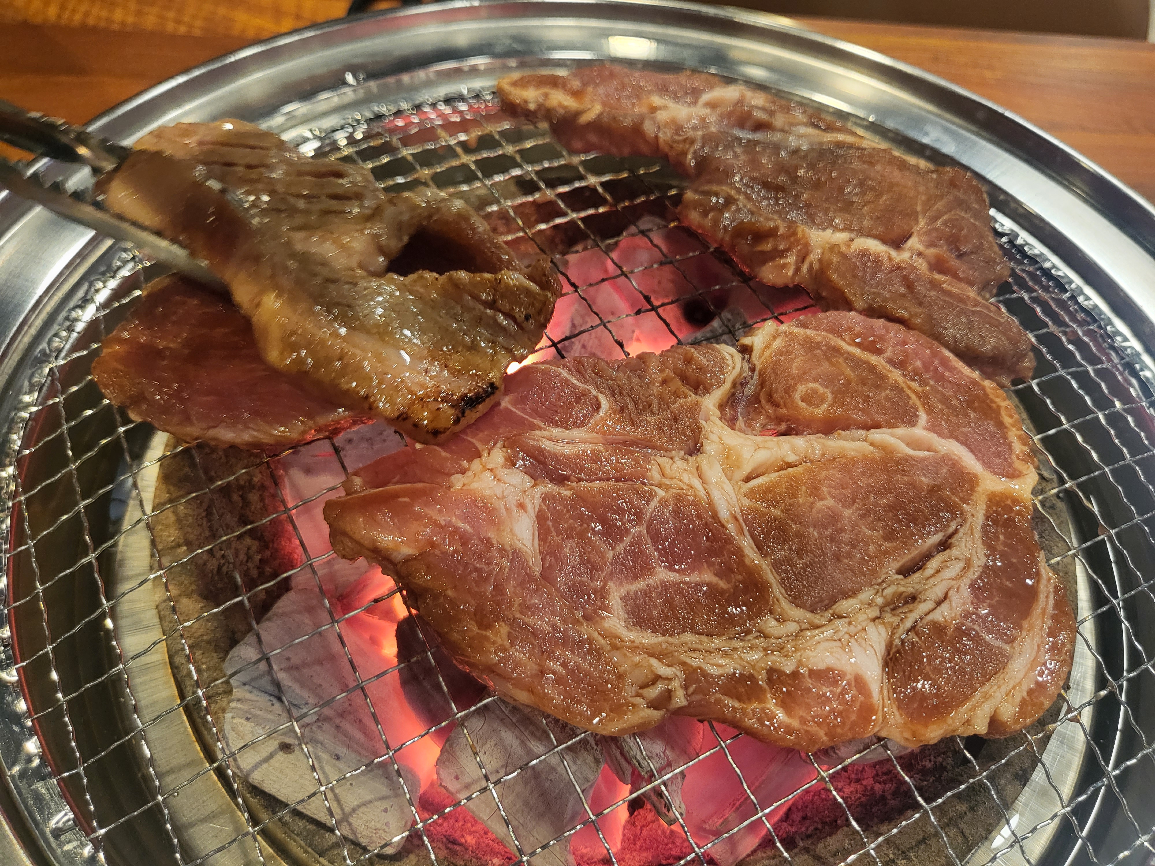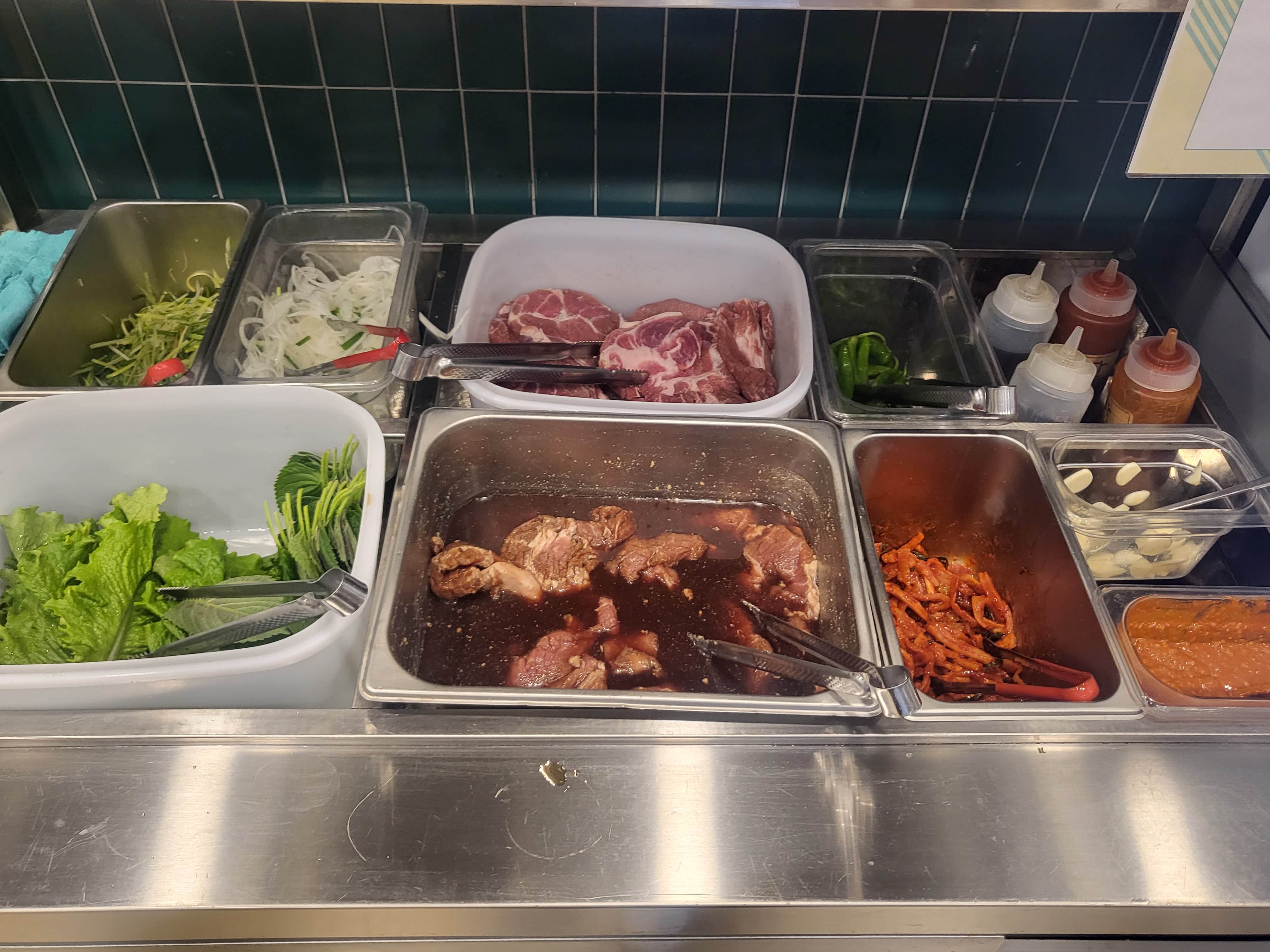 위와 같이 샐러드바에서 원하시는 야채와 드실만한 고기 가져다 드시면 되시구요. 불판은 주인장님께 갈아달라고 요청하셔야 해요. 그런데 양념갈비다보니 불판은 생각보다 빨리 타버리더라구요. 주인장님이 번거로우시겟지만 탄거 안드시려면 몇번이고 불판좀 갈아달라고 요청하셔야 할듯!