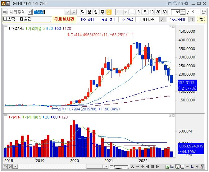 테슬라 주가는 2022년 연초대비 -55.49% 하락했습니다.