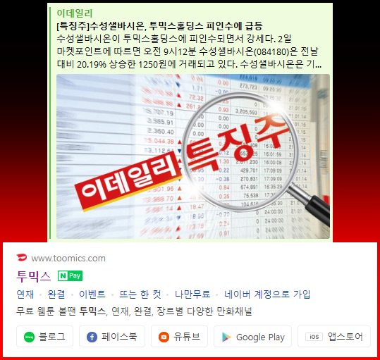 코스닥 상장기업 수성샐바시온이 투믹스홀딩스에 인수된다는 공시가 나왔다. 투믹스홀딩스는 현재 글로벌웹툰 회사인 '투믹스' 회사를 자회사로 보유한 상황인데, 이번에 수성샐바시온을 인수함에 따라 자회사 '투믹스'를 수성샐바시온과 합병시켜 우회상장하는게 아니냐는 기대감이 퍼지고 있다.
